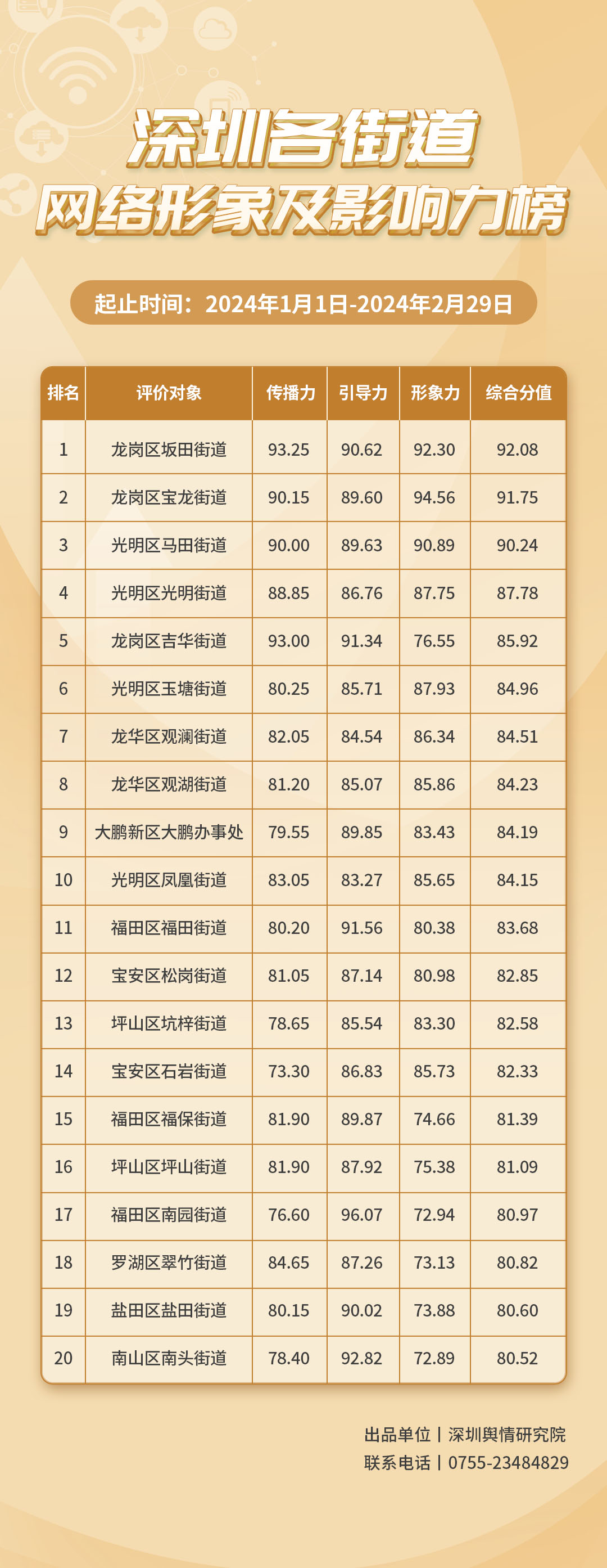 深圳新聞網3月21日訊(記者 王亞男 實習生 上官新昕) 2024年3月20日,深圳輿情研究院編制推出《深圳各街道網絡形象及影響力榜》(1-2月期),公布深圳市20個網絡形象及影響力建設成效靠前的街道,并指出深入了解各街道的網絡形象構建狀況和社會影響,有助于推動街道治理“提質增效”,增加城市高質量發展動能。