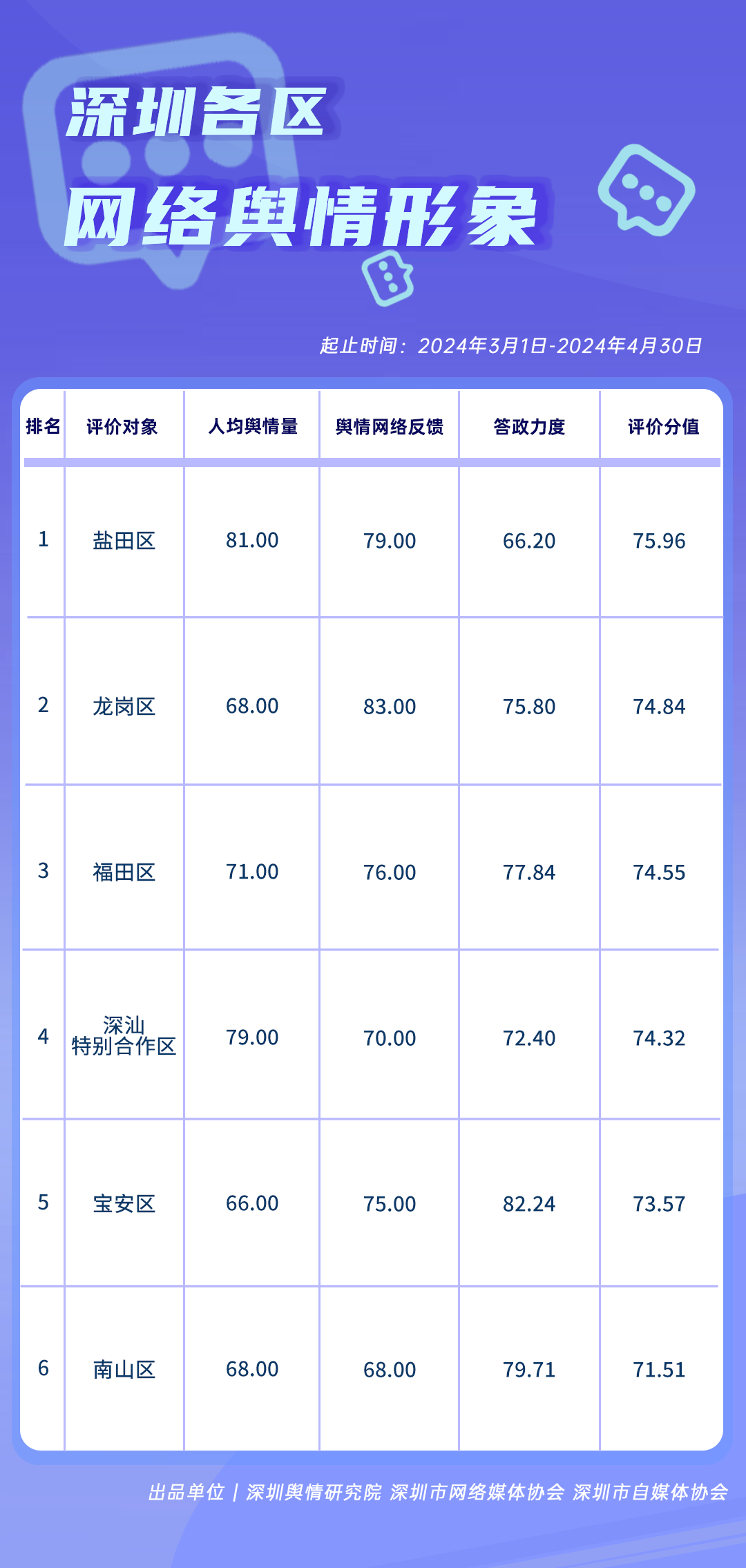 3-4月,福田區、龍崗區、南山區、鹽田區、大鵬新區、深汕特別合作區的網絡形象建設工作頗具成效,依次登上《深圳各區網絡形象建設榜》。其中,福田區榮登榜首,綜合形象得分為81.95分,且新媒體傳播形象得分達96.33分,展現出其以新媒體形象塑造為著力點,推進綜合網絡形象建設工作的一面。緊隨其后的是龍崗區,綜合形象得分接近80分,整體表現領先于其他多區,說明龍崗區在完善基層治理體系、維護良好網絡口碑等方面作出了較大努力。居于榜單第三至六名的南山區、鹽田區、大鵬新區和深汕特別合作區,在網絡形象建立及優化方面也具有可圈可點的表現,如鹽田區積極完善民生保障制度,賦能群眾美好生活,提升群眾的社會生活滿意度,南山區則借力政務新媒體矩陣,持續深化政務信息傳播工作,擴大新媒體矩陣影響力。