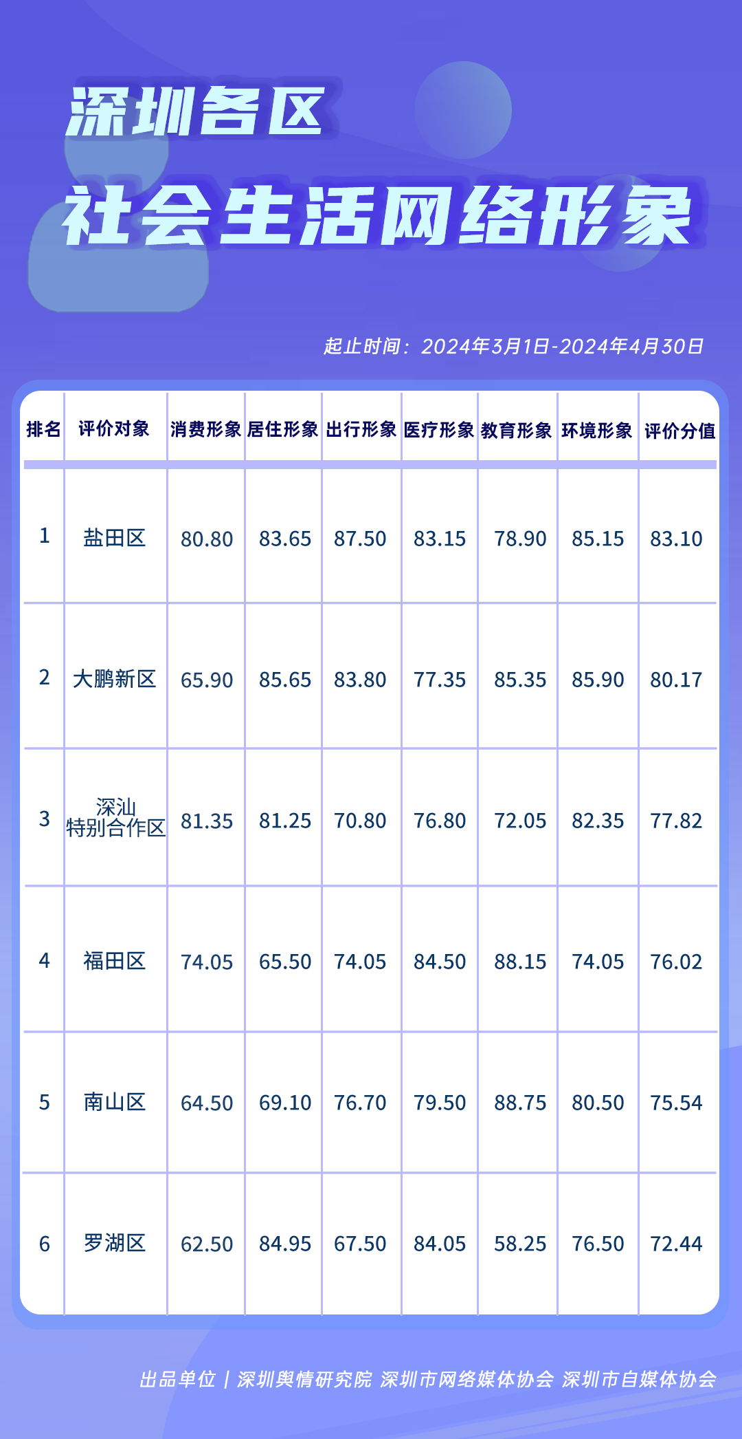 3-4月《深圳各區社會生活網絡形象榜》顯示,位居榜單第一名的鹽田區,評價分值為83.10分,且消費、居住、出行、醫療和環境形象方面均高于80分,整體社會生活網絡形象較佳。緊隨其后的大鵬新區在居住、教育和環境形象建設方面,取得的分數都高于85分,表明該區在打造優美宜居生活環境過程中收獲了較好反饋。位列第三的深汕特別合作區,在消費、居住、環境形象方面表現也相對較好,得分均在80分以上,助推其社會生活網絡形象綜合得分走高。福田區、南山區、羅湖區分別占據了榜單第四,第五和第六的位置,評價分值依次為76.02分、75.54分、72.44分,綜合水平良好,后續若能充分發揮優勢,著力補齊短板,排名有望持續提升。