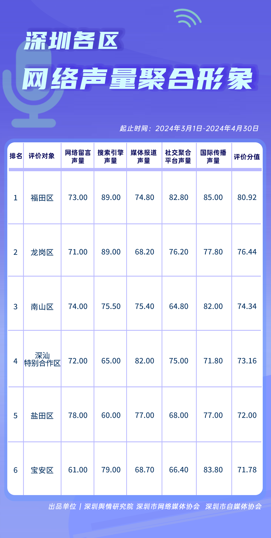 《深圳各區網絡形象建設榜》從深圳各區的網絡聲量聚合形象(100分)、社會生活網絡形象(100分)、新媒體傳播形象(100分)、網絡輿情形象(100分)四個維度展開綜合評價、計分排名,最終形成榜單。