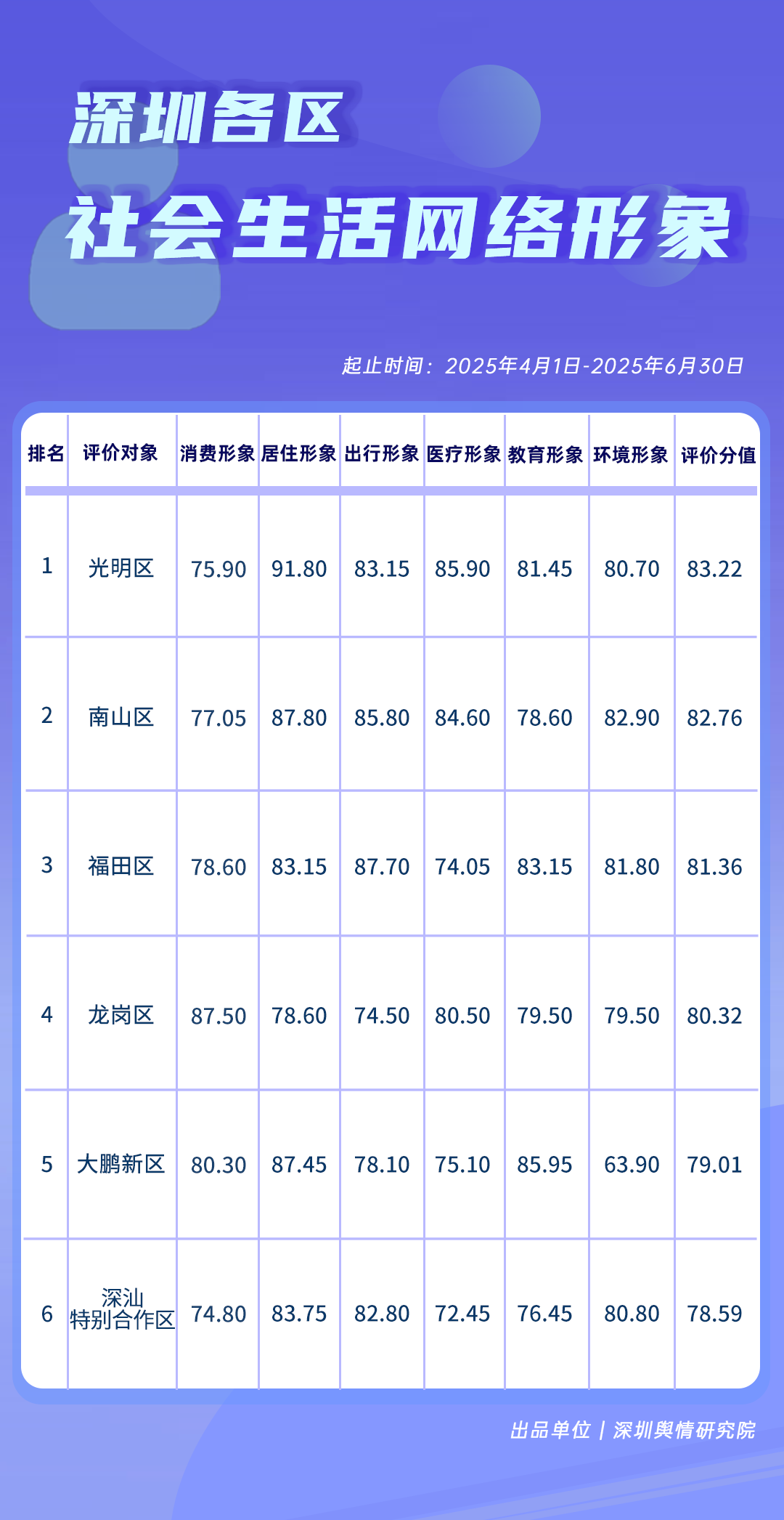 4-6月,《深圳各區社會生活網絡形象榜》中,光明區憑借在居住、醫療、出行等多方面的良好網絡呈現,獲得較高綜合評價分值,南山區、福田區、龍崗區也表現優異,四區綜合評價分值均超80分。大鵬新區、深汕特別合作區也在榜單中占據靠前位置,成為各區借助網絡力量增進民生福祉、推動協調發展的生動展現。