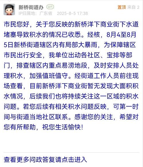 市民您好,關(guān)于您反映的新橋洋下商業(yè)街下水道堵塞導(dǎo)致積水的情況已收悉。經(jīng)核,8月4至8月5日新橋街道轄區(qū)內(nèi)有局部大暴雨,為保障轄區(qū)市民出行安全,我單位出動(dòng)各社區(qū)、寶排等部門(mén),排查轄區(qū)內(nèi)重點(diǎn)易澇地段,及時(shí)安排人員處理積水,加強(qiáng)值班值守。經(jīng)街道工作人員前往現(xiàn)場(chǎng)查看,目前新橋洋下商業(yè)街暫無(wú)發(fā)現(xiàn)大面積積水情況,后續(xù)我們也將持續(xù)關(guān)注這一區(qū)域的積水問(wèn)題。若您后續(xù)有相關(guān)積水問(wèn)題反映,可第一時(shí)間與街道當(dāng)?shù)厣鐓^(qū)聯(lián)系。感謝您的關(guān)注,希望對(duì)您有所幫助,祝您生活愉快!