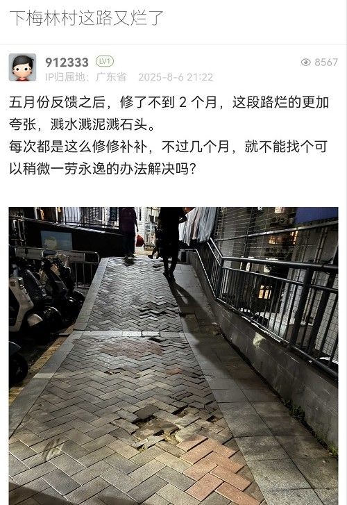網(wǎng)友您好,您的留言已收悉,現(xiàn)將相關(guān)處理情況回復(fù)如下:經(jīng)核實(shí),梅林街道圍面一街(四號(hào)路)存在人行道部分破損坑洼問(wèn)題,收到您的反映后梅林街道已第一時(shí)間協(xié)調(diào)市交通運(yùn)輸局福田管理局安排道路養(yǎng)護(hù)單位進(jìn)行修復(fù),并于2025年8月7日下午完成。后續(xù)梅林街道將加強(qiáng)巡查,及時(shí)協(xié)調(diào)管養(yǎng)單位進(jìn)行維護(hù),督促落實(shí)管養(yǎng)責(zé)任。如您有其他意見(jiàn)建議,歡迎直接電話(huà)聯(lián)系梅林街道應(yīng)急辦075523996865反映,感謝您的支持和理解!