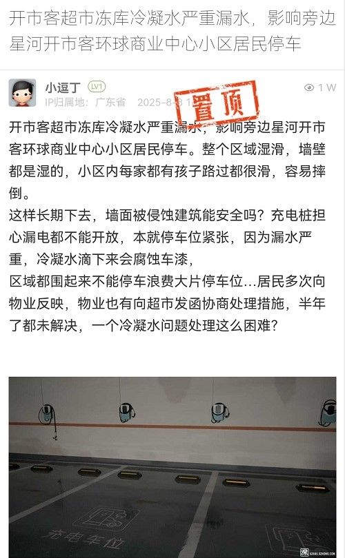 24. 帖文《開(kāi)市客超市凍庫(kù)冷凝水嚴(yán)重漏水,影響旁邊星河開(kāi)市客環(huán)球商業(yè)中心小區(qū)居民停車(chē)》