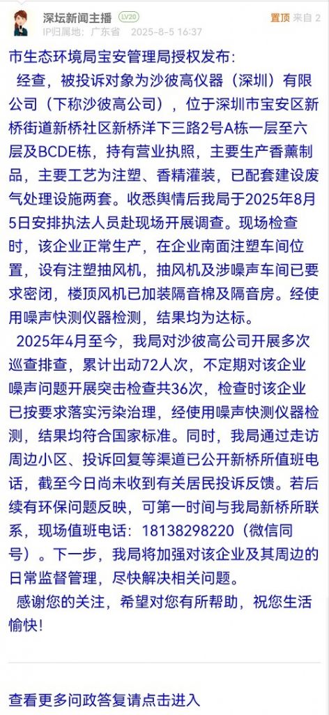 經(jīng)查,被投訴對(duì)象為沙彼高儀器(深圳)有限公司(下稱(chēng)沙彼高公司),位于深圳市寶安區(qū)新橋街道新橋社區(qū)新橋洋下三路2號(hào)A棟一層至六層及BCDE棟,持有營(yíng)業(yè)執(zhí)照,主要生產(chǎn)香薰制品,主要工藝為注塑、香精灌裝,已配套建設(shè)廢氣處理設(shè)施兩套。收悉輿情后我局于2025年8月5日安排執(zhí)法人員赴現(xiàn)場(chǎng)開(kāi)展調(diào)查。現(xiàn)場(chǎng)檢查時(shí),該企業(yè)正常生產(chǎn),在企業(yè)南面注塑車(chē)間位置,設(shè)有注塑抽風(fēng)機(jī),抽風(fēng)機(jī)及涉噪聲車(chē)間已要求密閉,樓頂風(fēng)機(jī)已加裝隔音棉及隔音房。經(jīng)使用噪聲快測(cè)儀器檢測(cè),結(jié)果均為達(dá)標(biāo)。