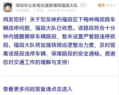 網(wǎng)友您好!關(guān)于您反映的福田區(qū)下梅林梅麗路車(chē)輛違停問(wèn)題,福田大隊(duì)已收悉。該路段符合十分鐘內(nèi)提醒挪移車(chē)輛路段,暫未設(shè)置嚴(yán)管路違停抓拍。福田大隊(duì)將加強(qiáng)鐵騎巡邏整治力度,及時(shí)驅(qū)離該路段違停車(chē)輛,保障路段的安全通暢。感謝您對(duì)交通工作的理解與支持!