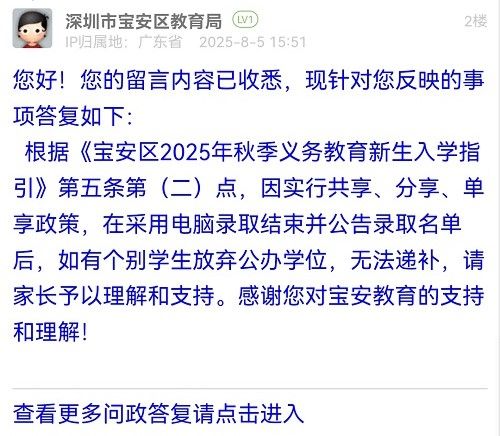 根據(jù)《寶安區(qū)2025年秋季義務(wù)教育新生入學(xué)指引》第五條第(二)點(diǎn),因?qū)嵭泄蚕怼⒎窒?、單享政策,在采用電腦錄取結(jié)束并公告錄取名單后,如有個(gè)別學(xué)生放棄公辦學(xué)位,無(wú)法遞補(bǔ),請(qǐng)家長(zhǎng)予以理解和支持。感謝您對(duì)寶安教育的支持和理解!