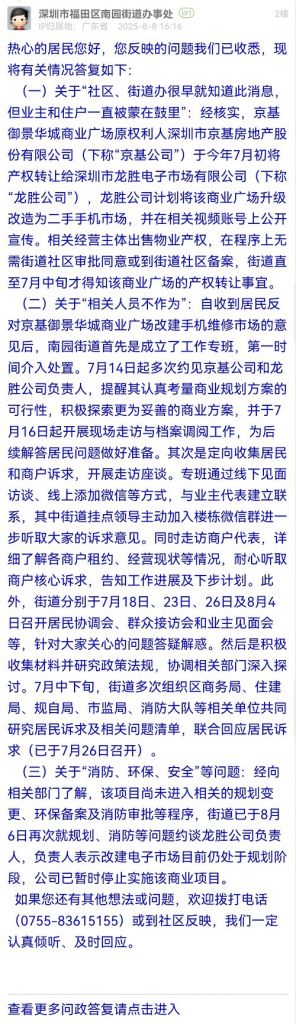 (二)關(guān)于“相關(guān)人員不作為”:自收到居民反對(duì)京基御景華城商業(yè)廣場(chǎng)改建手機(jī)維修市場(chǎng)的意見(jiàn)后,南園街道首先是成立了工作專(zhuān)班,第一時(shí)間介入處置。7月14日起多次約見(jiàn)京基公司和龍勝公司負(fù)責(zé)人,提醒其認(rèn)真考量商業(yè)規(guī)劃方案的可行性,積極探索更為妥善的商業(yè)方案,并于7月16日起開(kāi)展現(xiàn)場(chǎng)走訪(fǎng)與檔案調(diào)閱工作,為后續(xù)解答居民問(wèn)題做好準(zhǔn)備。其次是定向收集居民和商戶(hù)訴求,開(kāi)展走訪(fǎng)座談。專(zhuān)班通過(guò)線(xiàn)下見(jiàn)面訪(fǎng)談、線(xiàn)上添加微信等方式,與業(yè)主代表建立聯(lián)系,其中街道掛點(diǎn)領(lǐng)導(dǎo)主動(dòng)加入樓棟微信群進(jìn)一步聽(tīng)取大家的訴求意見(jiàn)。同時(shí)走訪(fǎng)商戶(hù)代表,詳細(xì)了解各商戶(hù)租約、經(jīng)營(yíng)現(xiàn)狀等情況,耐心聽(tīng)取商戶(hù)核心訴求,告知工作進(jìn)展及下步計(jì)劃。此外,街道分別于7月18日、23日、26日及8月4日召開(kāi)居民協(xié)調(diào)會(huì)、群眾接訪(fǎng)會(huì)和業(yè)主見(jiàn)面會(huì)等,針對(duì)大家關(guān)心的問(wèn)題答疑解惑。然后是積極收集材料并研究政策法規(guī),協(xié)調(diào)相關(guān)部門(mén)深入探討。7月中下旬,街道多次組織區(qū)商務(wù)局、住建局、規(guī)自局、市監(jiān)局、消防大隊(duì)等相關(guān)單位共同研究居民訴求及相關(guān)問(wèn)題清單,聯(lián)合回應(yīng)居民訴求(已于7月26日召開(kāi))。