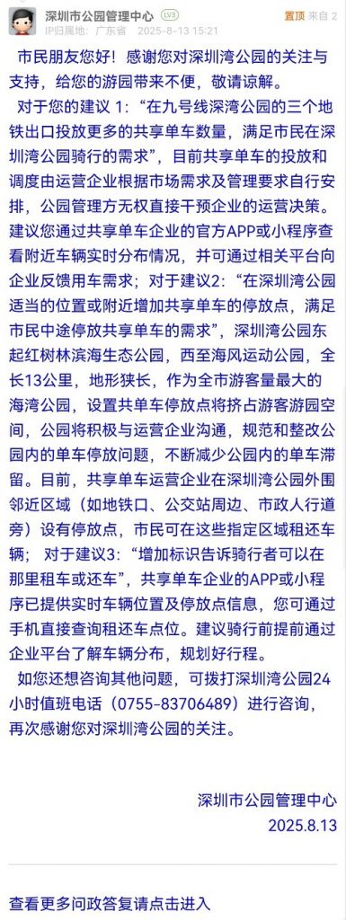 對(duì)于您的建議 1:“在九號(hào)線(xiàn)深灣公園的三個(gè)地鐵出口投放更多的共享單車(chē)數(shù)量,滿(mǎn)足市民在深圳灣公園騎行的需求”,目前共享單車(chē)的投放和調(diào)度由運(yùn)營(yíng)企業(yè)根據(jù)市場(chǎng)需求及管理要求自行安排,公園管理方無(wú)權(quán)直接干預(yù)企業(yè)的運(yùn)營(yíng)決策。建議您通過(guò)共享單車(chē)企業(yè)的官方APP或小程序查看附近車(chē)輛實(shí)時(shí)分布情況,并可通過(guò)相關(guān)平臺(tái)向企業(yè)反饋用車(chē)需求;對(duì)于建議2:“在深圳灣公園適當(dāng)?shù)奈恢没蚋浇黾庸蚕韱诬?chē)的停放點(diǎn),滿(mǎn)足市民中途停放共享單車(chē)的需求”,深圳灣公園東起紅樹(shù)林濱海生態(tài)公園,西至海風(fēng)運(yùn)動(dòng)公園,全長(zhǎng)13公里,地形狹長(zhǎng),作為全市游客量最大的海灣公園,設(shè)置共單車(chē)停放點(diǎn)將擠占游客游園空間,公園將積極與運(yùn)營(yíng)企業(yè)溝通,規(guī)范和整改公園內(nèi)的單車(chē)停放問(wèn)題,不斷減少公園內(nèi)的單車(chē)滯留。目前,共享單車(chē)運(yùn)營(yíng)企業(yè)在深圳灣公園外圍鄰近區(qū)域(如地鐵口、公交站周邊、市政人行道旁)設(shè)有停放點(diǎn),市民可在這些指定區(qū)域租還車(chē)輛; 對(duì)于建議3:“增加標(biāo)識(shí)告訴騎行者可以在那里租車(chē)或還車(chē)”,共享單車(chē)企業(yè)的APP或小程序已提供實(shí)時(shí)車(chē)輛位置及停放點(diǎn)信息,您可通過(guò)手機(jī)直接查詢(xún)租還車(chē)點(diǎn)位。建議騎行前提前通過(guò)企業(yè)平臺(tái)了解車(chē)輛分布,規(guī)劃好行程。
