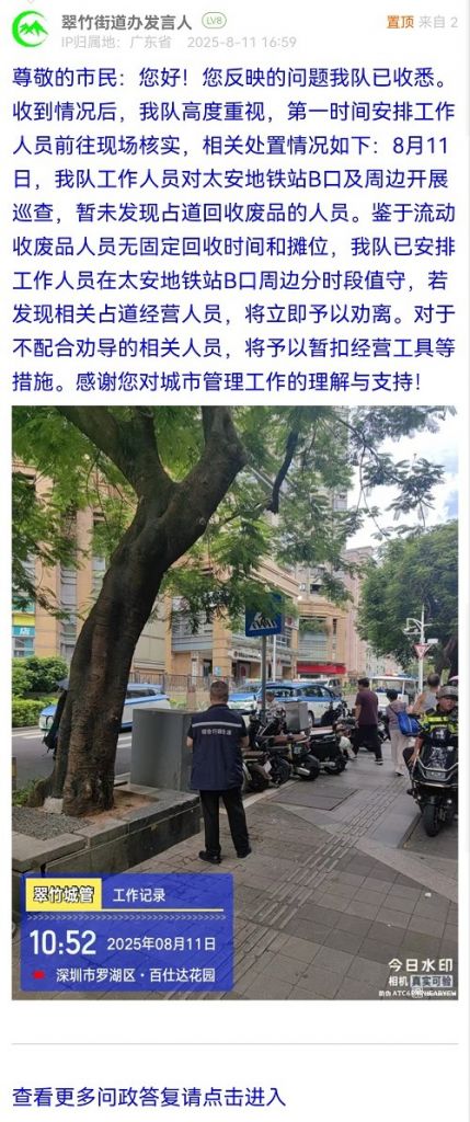 尊敬的市民:您好!您反映的問(wèn)題我隊(duì)已收悉。收到情況后,我隊(duì)高度重視,第一時(shí)間安排工作人員前往現(xiàn)場(chǎng)核實(shí),相關(guān)處置情況如下:8月11日,我隊(duì)工作人員對(duì)太安地鐵站B口及周邊開(kāi)展巡查,暫未發(fā)現(xiàn)占道回收廢品的人員。鑒于流動(dòng)收廢品人員無(wú)固定回收時(shí)間和攤位,我隊(duì)已安排工作人員在太安地鐵站B口周邊分時(shí)段值守,若發(fā)現(xiàn)相關(guān)占道經(jīng)營(yíng)人員,將立即予以勸離。對(duì)于不配合勸導(dǎo)的相關(guān)人員,將予以暫扣經(jīng)營(yíng)工具等措施。感謝您對(duì)城市管理工作的理解與支持!
