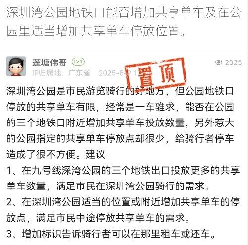 31. 帖文《深圳灣公園地鐵口能否增加共享單車(chē)及在公園里適當(dāng)增加共享單車(chē)停放位置。》