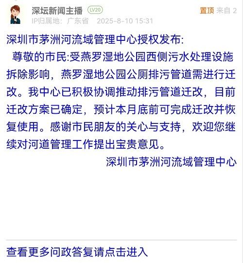 尊敬的市民:受燕羅濕地公園西側(cè)污水處理設(shè)施拆除影響,燕羅濕地公園公廁排污管道需進(jìn)行遷改。我中心已積極協(xié)調(diào)推動(dòng)排污管道遷改,目前遷改方案已確定,預(yù)計(jì)本月底前可完成遷改并恢復(fù)使用。感謝市民朋友的關(guān)心與支持,歡迎您繼續(xù)對(duì)河道管理工作提出寶貴意見(jiàn)。