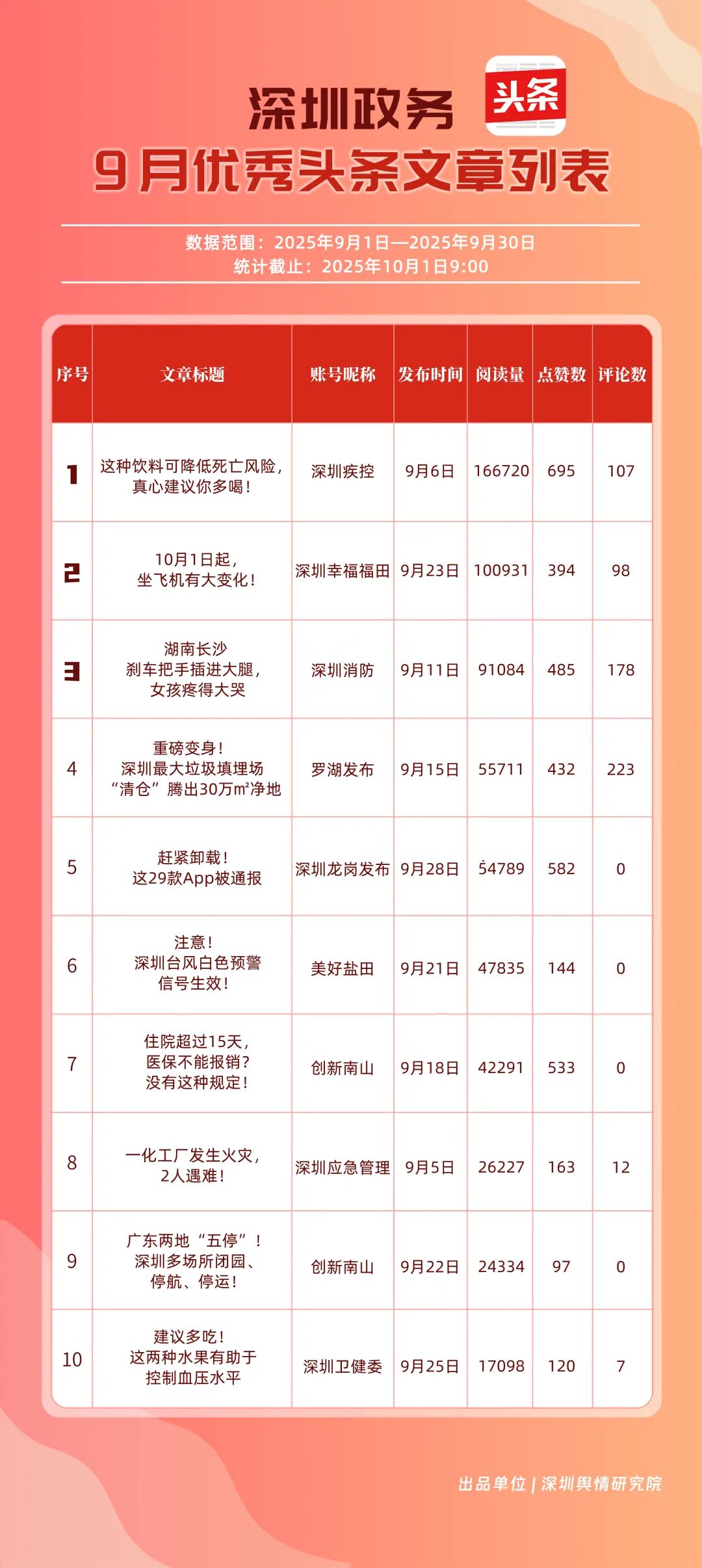 9月,“深圳幸福福田”“深圳疾控”“深圳消防”“羅湖發布”“深圳龍崗發布”“創新南山”“深圳龍華”“青春深圳”“深圳人社”“濱海寶安”共10個政務頭條號入選“優秀政務頭條號”榜單。“深圳幸福福田”穩居榜單首位,在傳播、互動等方面均表現卓越;“深圳疾控”關注民生健康,有關“喝茶的好處”“非正規醫美針風險”兩篇文章閱讀均超10萬次,為市民提供健康信息;“深圳消防”聚焦消防安全領域,提醒市民注意安全。相關上榜賬號表現優異,注重內容實用化、互動場景化,彰顯了政務新媒體的服務效能。