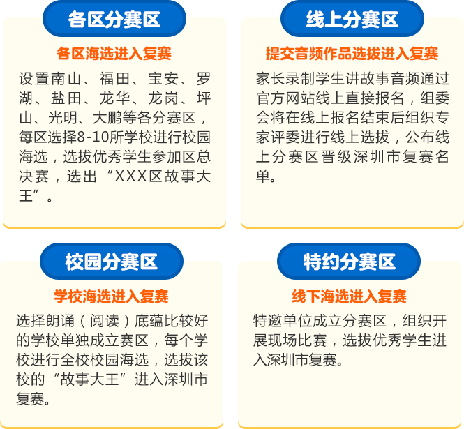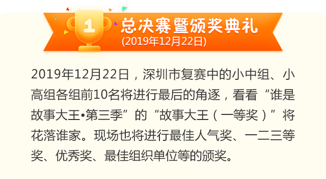 讓閱讀成為動人的風景,讓故事的魅力感動深圳。為助力建設良好的青少年閱讀環境,激發學生閱讀興趣,倡導親子閱讀,共建和諧家庭關系。2020年,第二十一屆深圳讀書月主題活動“誰是故事大王·第四季”在共青團深圳市委員會、深圳市關愛行動組委會辦公室的指導下再出發。更長的活動周期,更豐富的參與形式,更專業的賽制,“誰是故事大王·第四季”等你來解鎖與挑戰!